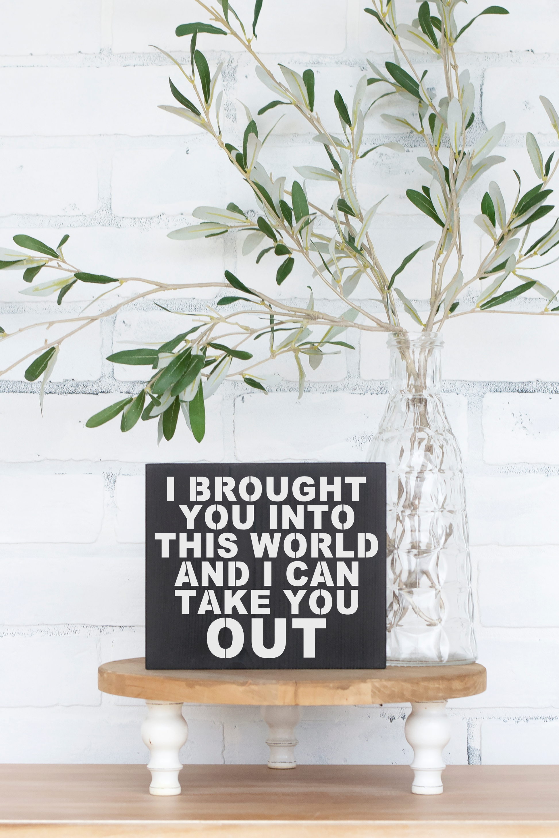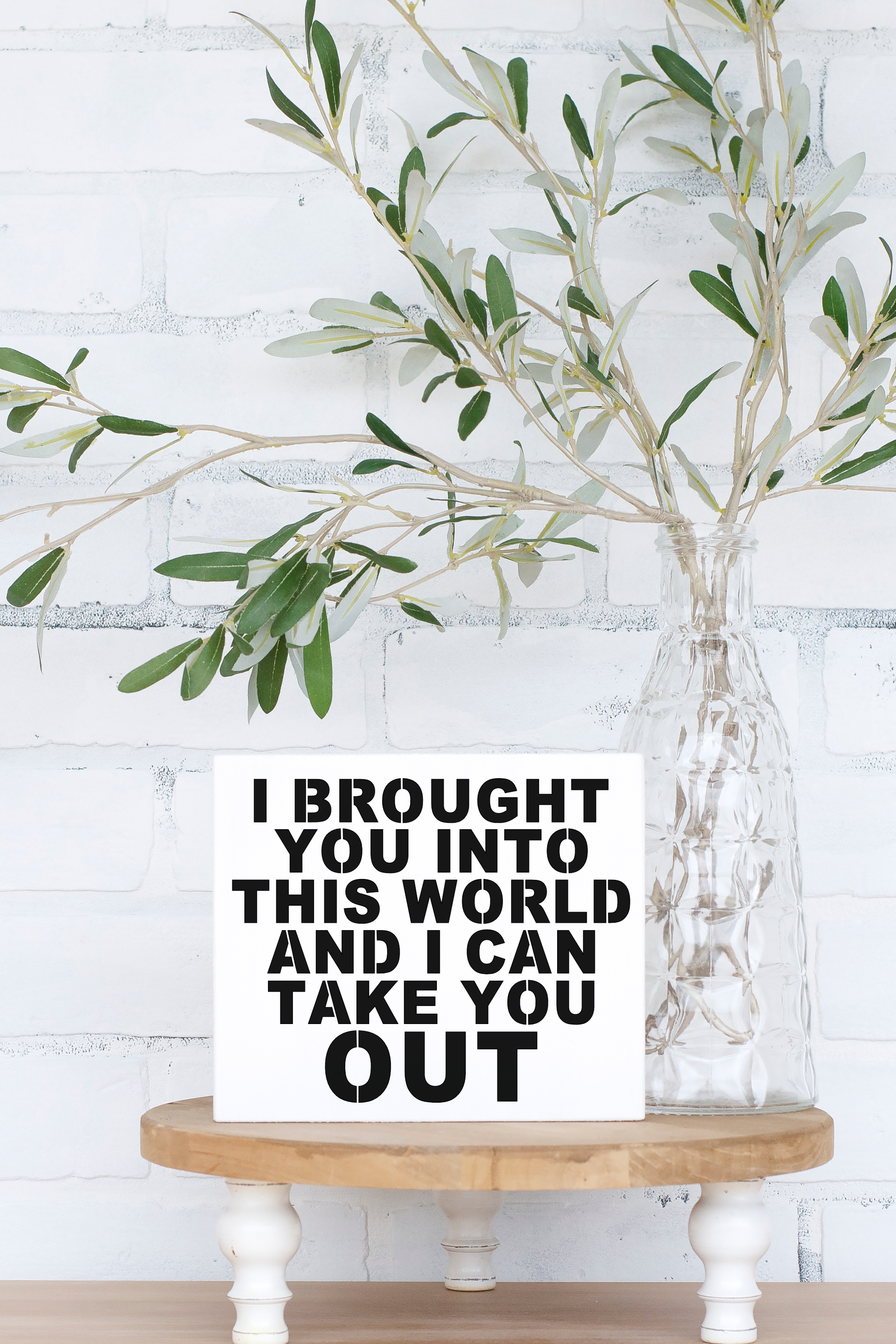 This 8x6 I brought you into this world and I can take you out Wood Sign is the perfect addition to your home. Constructed from sustainable pine wood, it is sealed for protection and comes with a sawtooth hanger for easy display. Its humorous message is sure to inspire conversation and laughter.