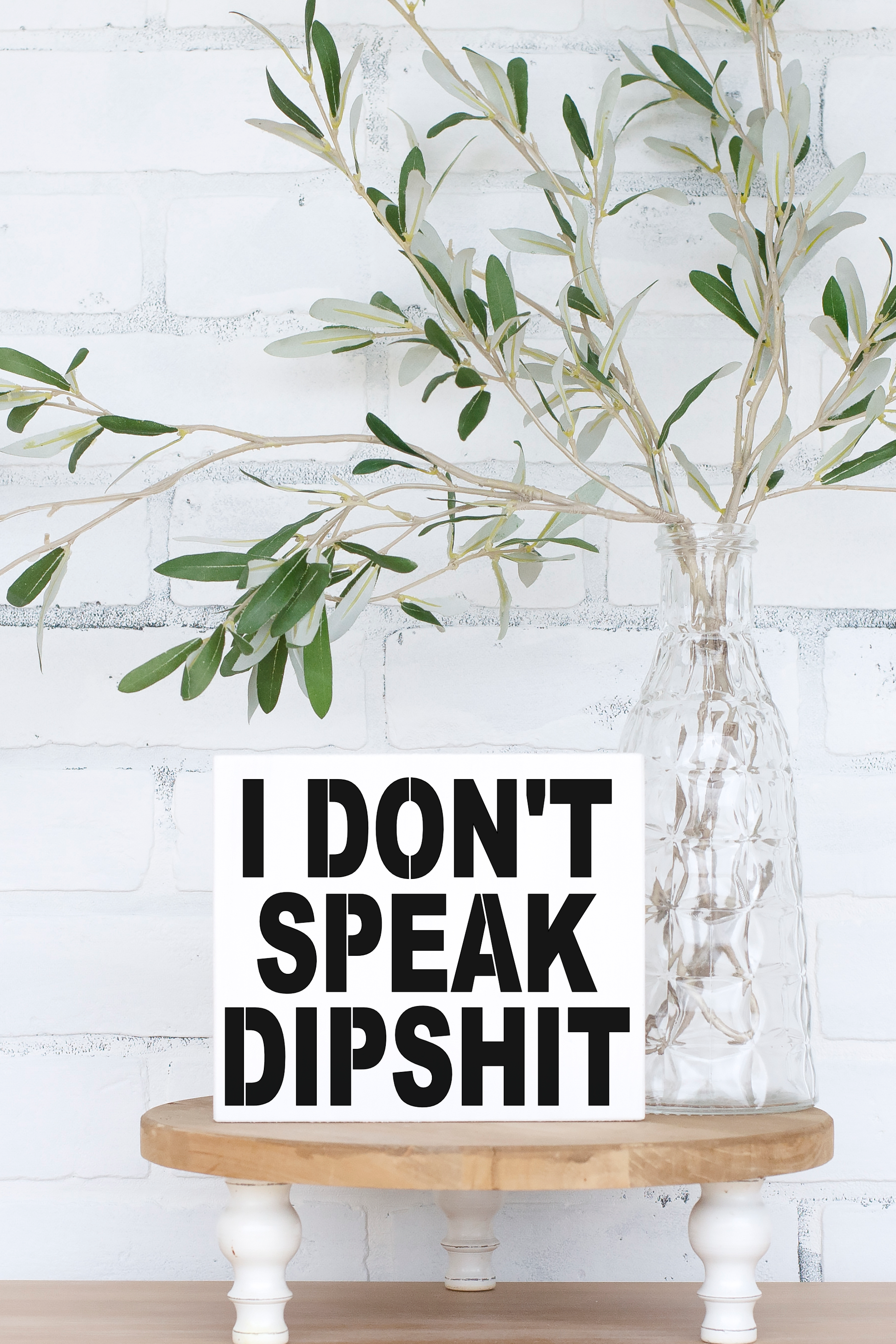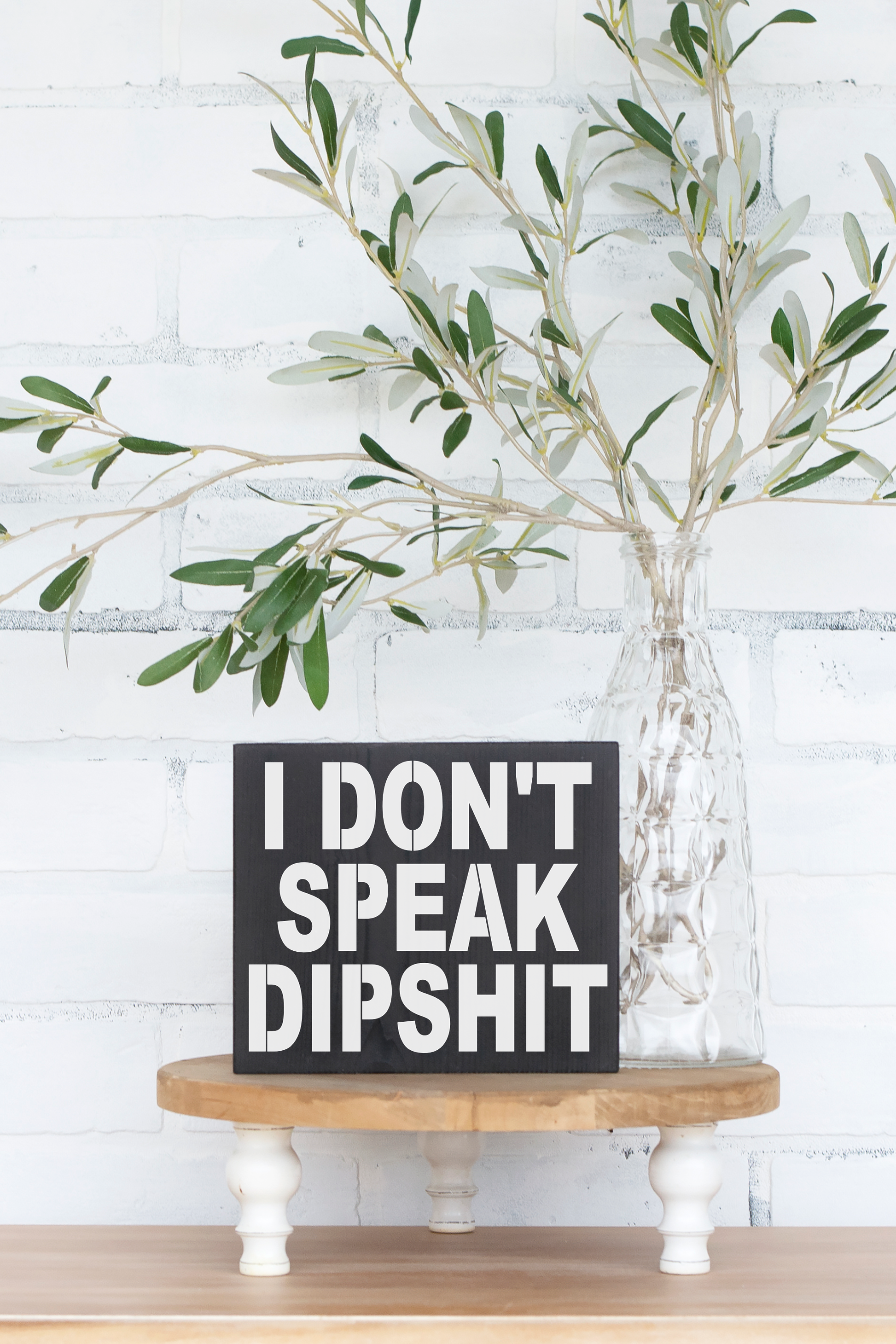 This 8x6 I dont Speak Dipshit Wood Sign is the perfect addition to your home. Constructed from sustainable pine wood, it is sealed for protection and comes with a sawtooth hanger for easy display. Its humorous message is sure to inspire conversation and laughter.