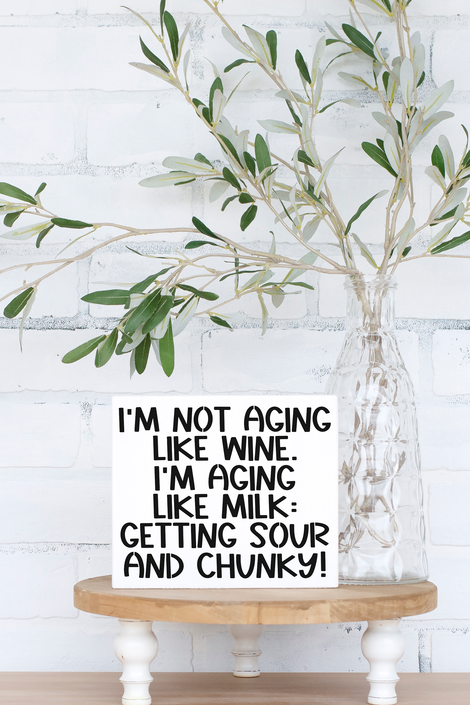 This 8x6 Im Not Aging Like Wine, Im Aging Like Mild, Getting Sour and Chunky! Wood Sign is the perfect addition to your home. Constructed from sustainable pine wood, it is sealed for protection and comes with a sawtooth hanger for easy display. Its humorous message is sure to inspire conversation and laughter.