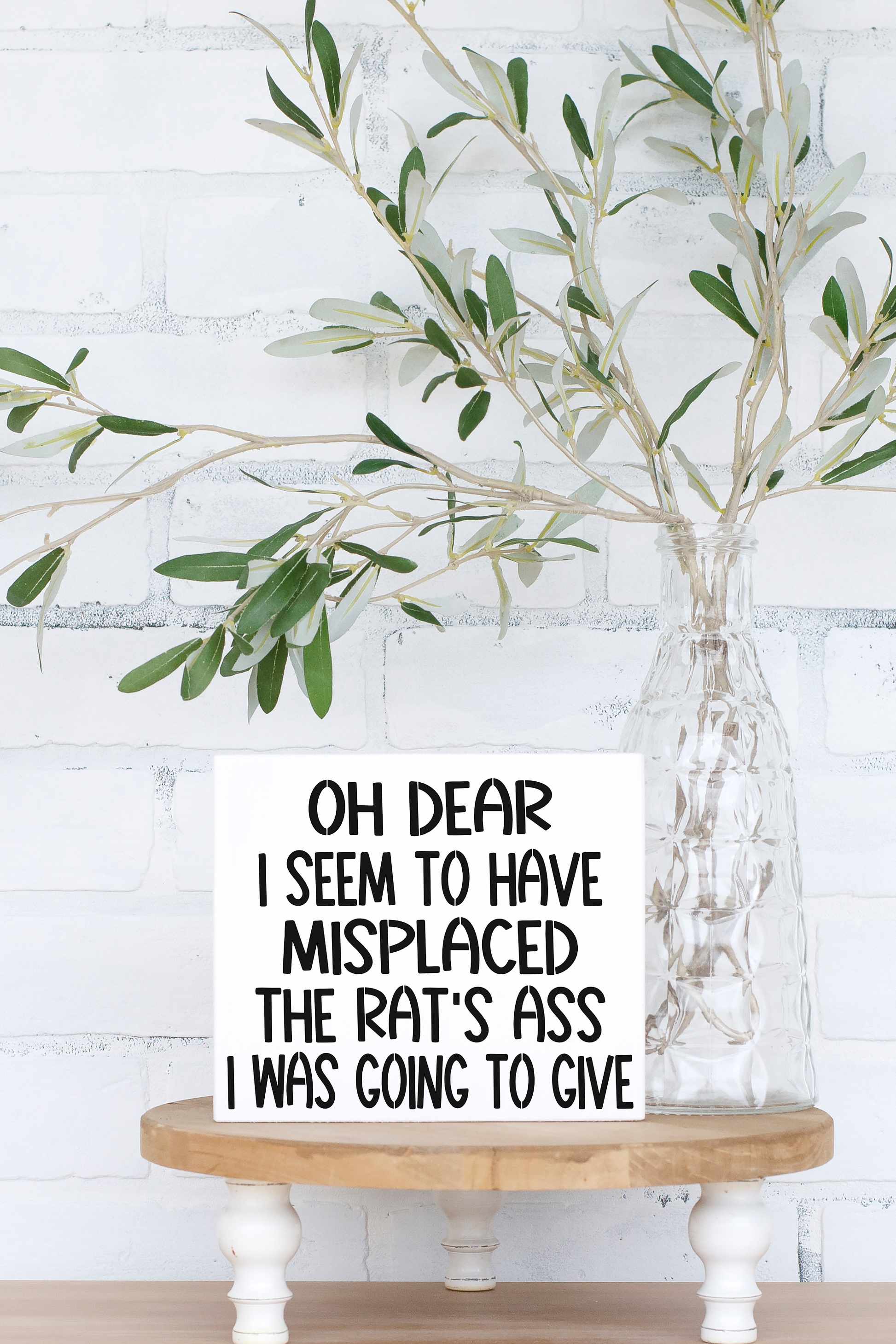 This 8x6 Oh Dear I Seem to have misplaces the Rats Ass I was going to give Wood Sign is the perfect addition to your home. Constructed from sustainable pine wood, it is sealed for protection and comes with a sawtooth hanger for easy display. Its humorous message is sure to inspire conversation and laughter.