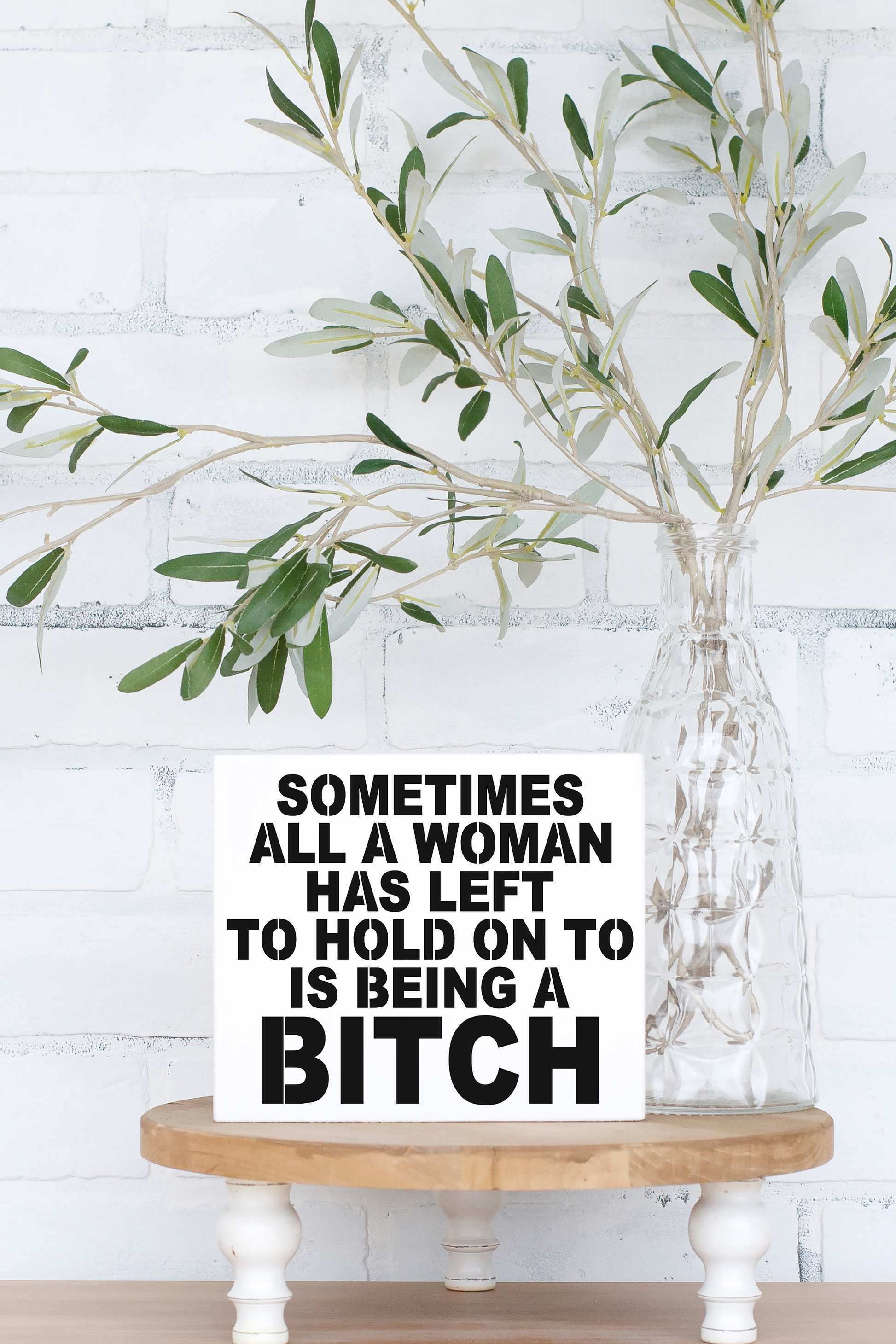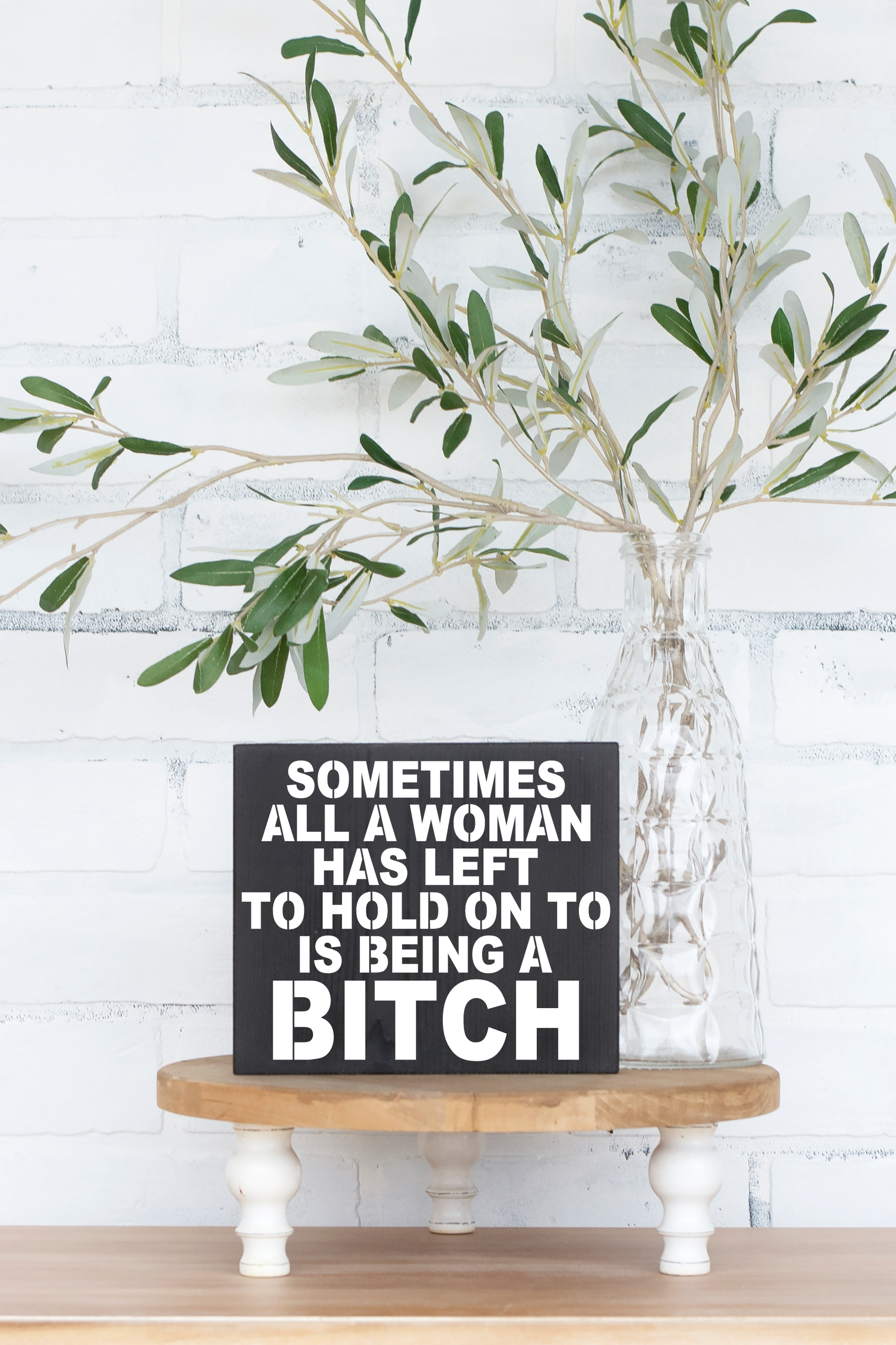 This 8x6 Sometimes all a woman has to hold onto is being a BITCH Wood Sign is the perfect addition to your home. Constructed from sustainable pine wood, it is sealed for protection and comes with a sawtooth hanger for easy display. Its humorous message is sure to inspire conversation and laughter.