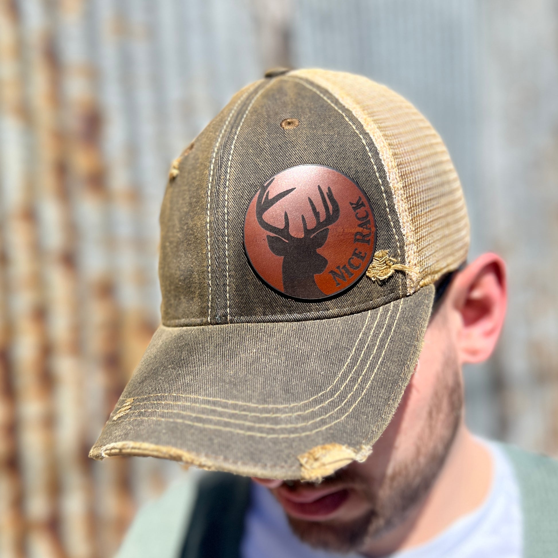 This Black Distressed Baseball Cap features a cotton mesh back, adjustable snapback closure, and a geniune leather lase cut patch with a "Nice Rack" graphic design. Its low-profile design offers an ultra comfortable fit.
