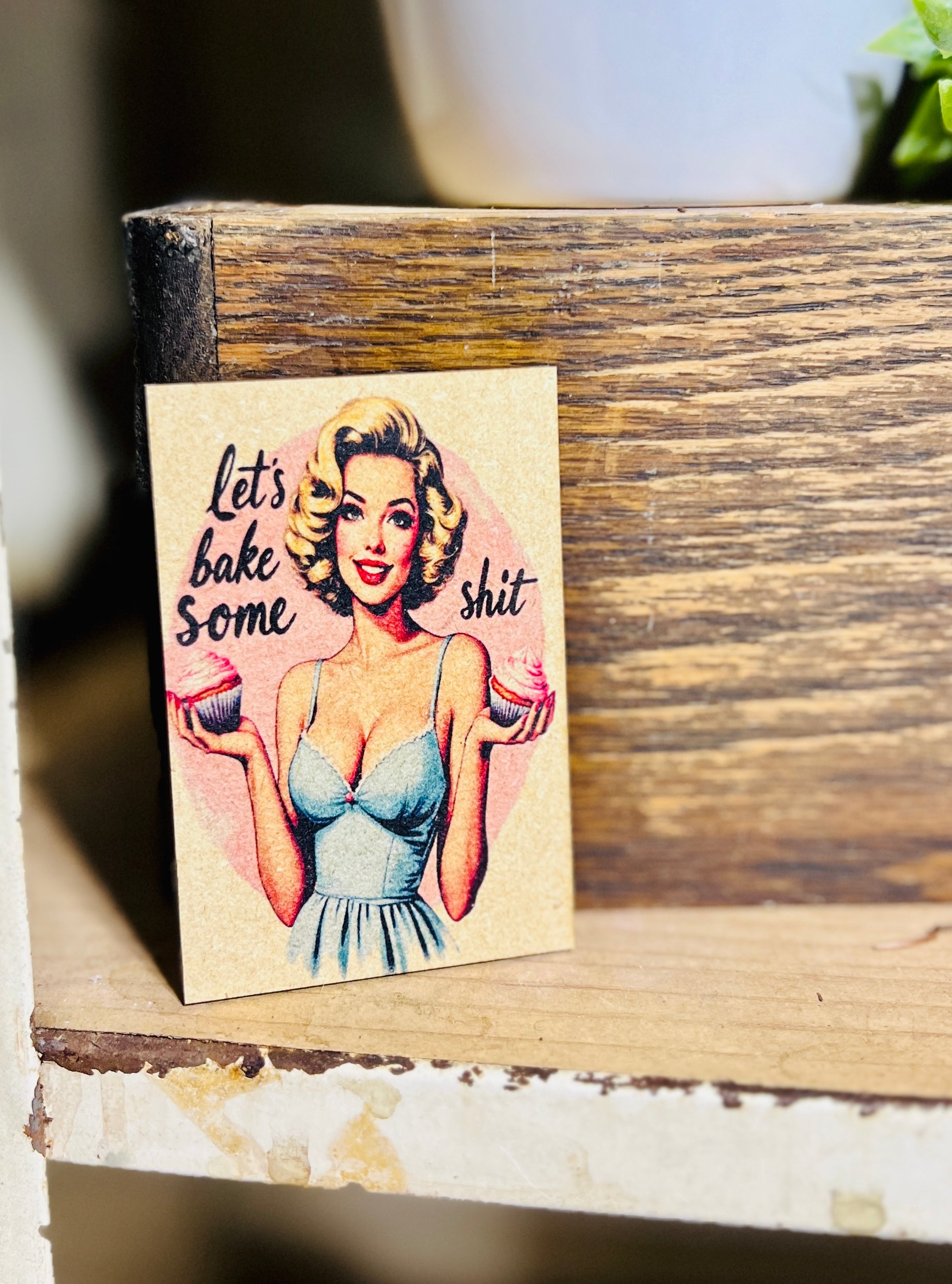 This kitchen magnet features a graphic print on a 3x2 wooden plaque, equipped with a small magnet on the back for easy attachment.